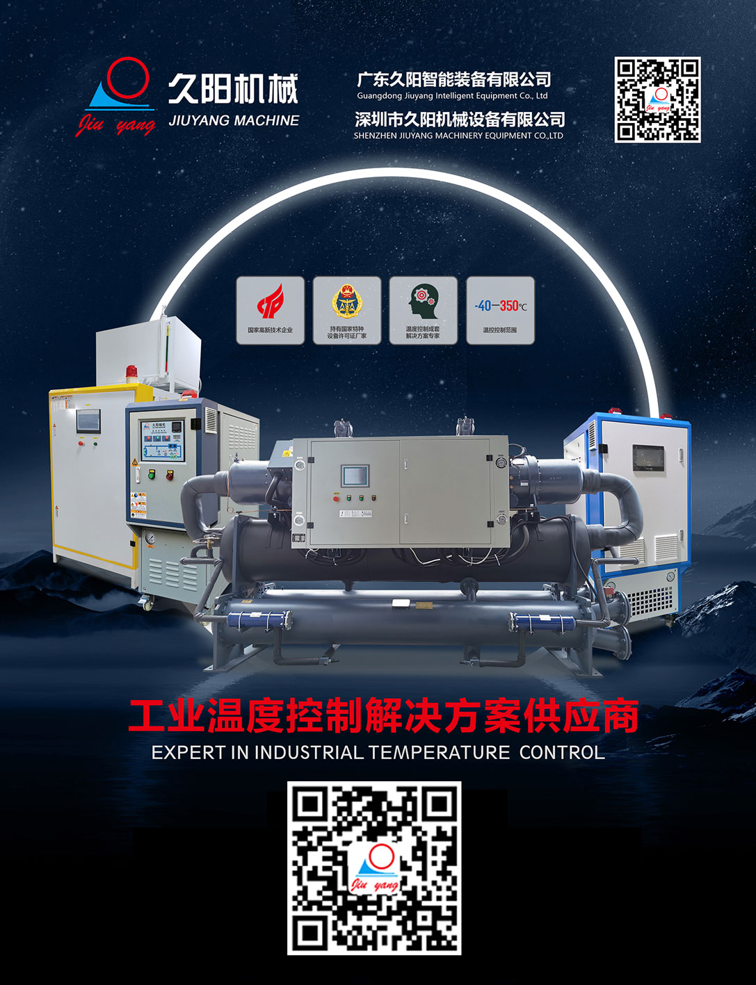 深圳市久阳机械设备有限公司位于广东省深圳市光明区,久阳工程师及科研人员不断研究、设计推陈出新后,形成了以模温机、压铸模温机、水温机、注塑水温机、油温机、模具油温机、油加热器、防爆油加热器、冷水机、工业冷水机、螺杆冷水机、风冷式冷水机、冷热一体机、导热油炉、电加热导热油炉为核心的设备生产体系。 久阳设备主要用于复合材料成型、新能源电池、锂电池隔膜、汽车内饰配件、镁铝合金压铸、化工反应釜、食品制药行业、橡胶和塑料制品、纺织印染、造纸印刷、烘箱烘房等行业领域。