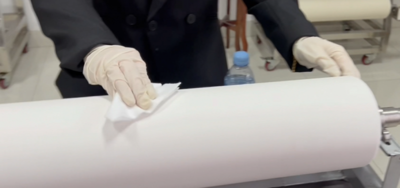 胶辊完全干燥后,用静电膜匀速缠绕,力度轻柔,隔绝灰尘、杂质和空气即可。